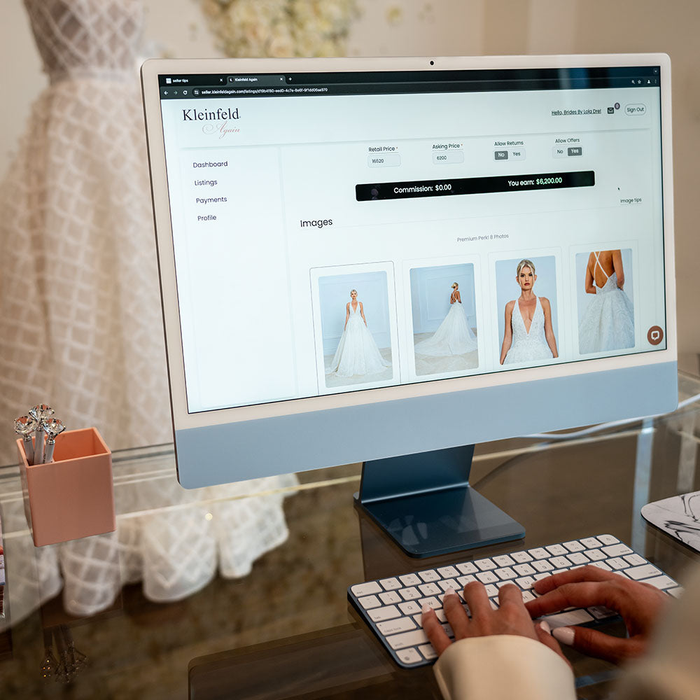 Your selling adventure starts with an effortless account creation at Kleinfeld Again. Our platform offers two tailored listing options to suit your preferences: the Standard or the Premium listing. The Standard option allows for four photos and a detailed description, while the Premium listing grants you eight photos and prioritized visibility by featuring your dress in related searches and collections, ensuring your gown stands out at the top of buyer's search results.