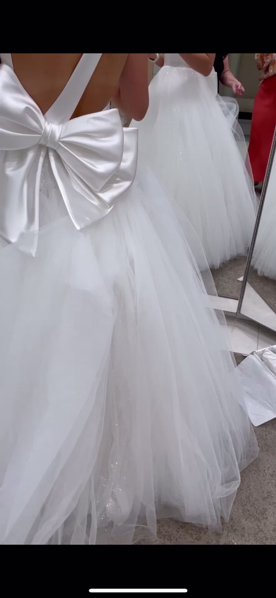 Beautiful custom Pnina Tornai gown inspired by her Love by Pnina style. Satin bodice and tulle A-line skirt with V-neckline and asymmetrical back strap detail; tulle skirt embellished with a layer of shimmer fabric and satin bow. This gown has a 2.5 ft long train (*video shows the dress bustled) and custom sparkle layer added for a little shimmer when the gown moves and sways! Super romantic fairytale vibes. Dress is brand new, never worn because I bought two that I fell in love with, and ultimately went with the other dress! This gown is so gorgeous, I really want another bride to be able to wear it and feel stunning on her wedding day. Congratulations, bride-to-be!!! Dress has been tailored by Kleinfeld professional tailor to fit my body measurements