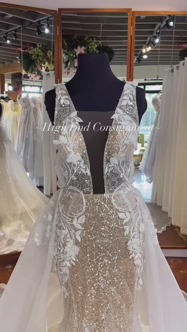 Color | Ivory with nude lining, with off-white overlay skirt & off-white cathedral veil |