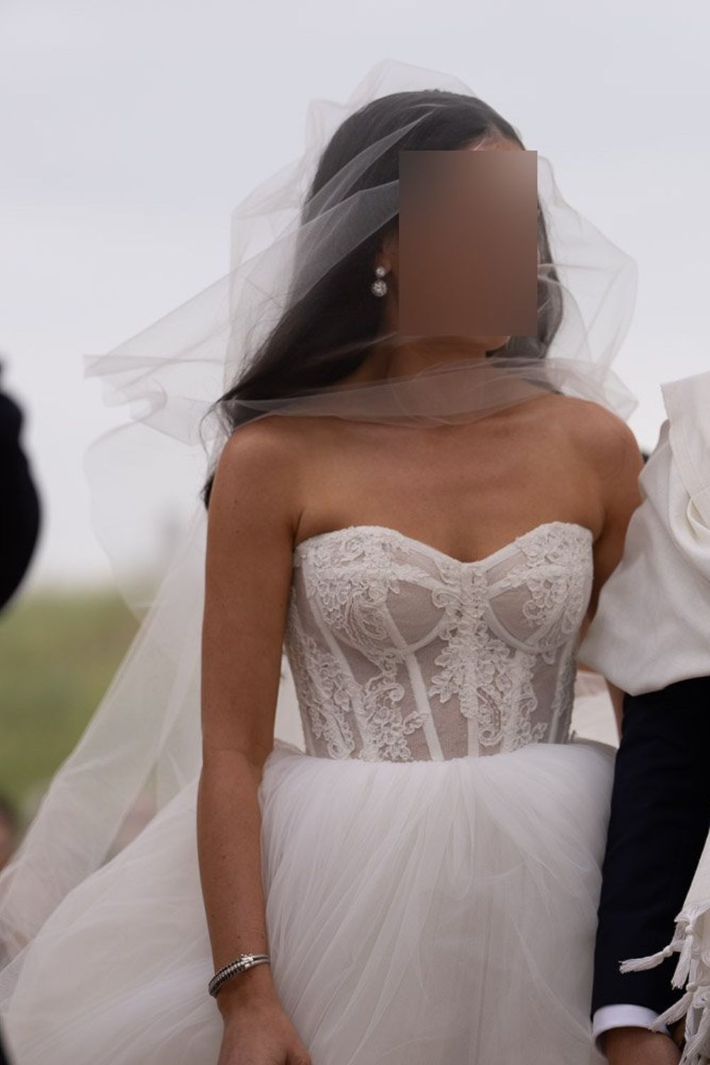 - Corset bodice, Lace appliqué, Layered skirt